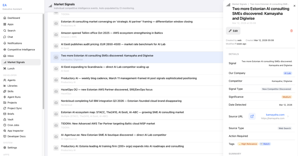 Another monitors the broader market for signals relevant to the CEO’s strategic priorities. When it finds something noteworthy, it doesn’t just dump a link. It adds the signal with context and its own research. Think of it as a research analyst who never sleeps and reads every relevant source in every language.