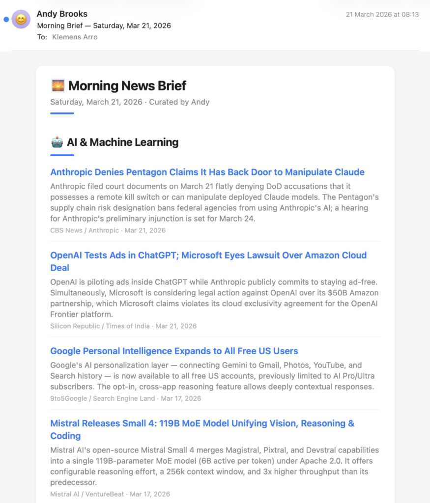 Separate from micro app monitoring, the EA delivers a morning briefing every day based on a different set of sources entirely: news outlets, social media platforms, and specific websites that matter for the executive’s field. In our case, LLM provider announcements, European regulatory updates, industry publications, and similar sources.