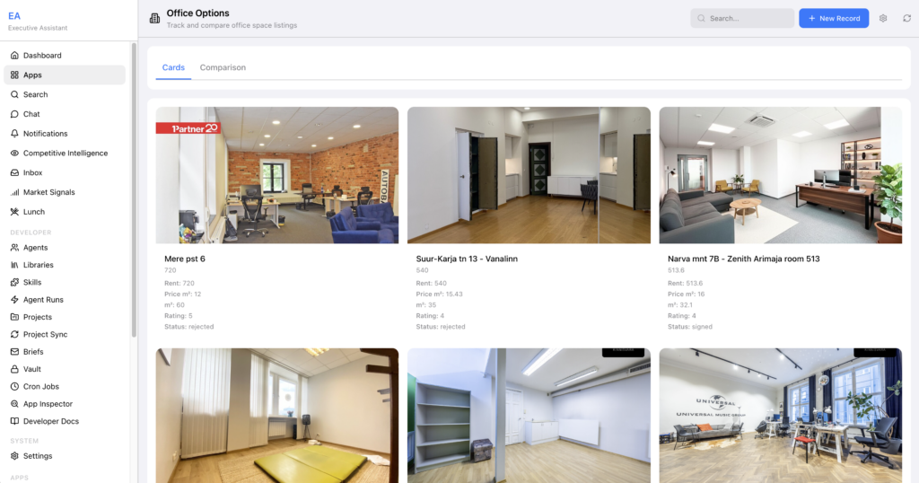 We recently went through finding new office space. A micro app monitored suitable listings on real-estate portals. New listing matching our preferences? Automatically added, notification sent. But it didn’t stop at monitoring. The same app tracked shortlisted options, communications with realtors, comparisons, and notes. A complete project management hub, built and running within minutes of deciding we needed it. When we found our office, the app had served its purpose. No enterprise software to decommission. It simply finished its job.